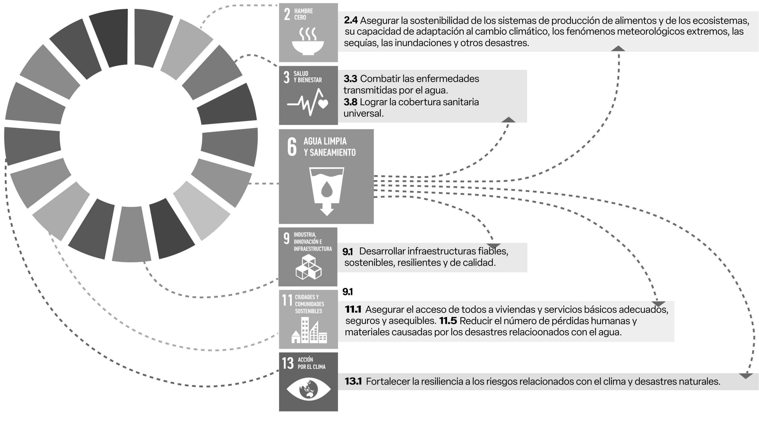 En el Informe Mundial de las Naciones Unidas sobre el Desarrollo de los Recursos Hídricos (2018) se planteó que las SbN son propuestas tecnocientíficas que retoman saberes ancestrales o que imitan o se benefician de los procesos naturales mejorando la gestión hídrica (WWAP, 2018). En el marco internacional se han ido posicionando en el interés de la sociedad con el fin de alcanzar los objetivos planteados en la Agenda 2030 y particularmente las metas del objetivo 6 para el desarrollo sostenible: “Agua limpia y saneamiento” (figura 1).