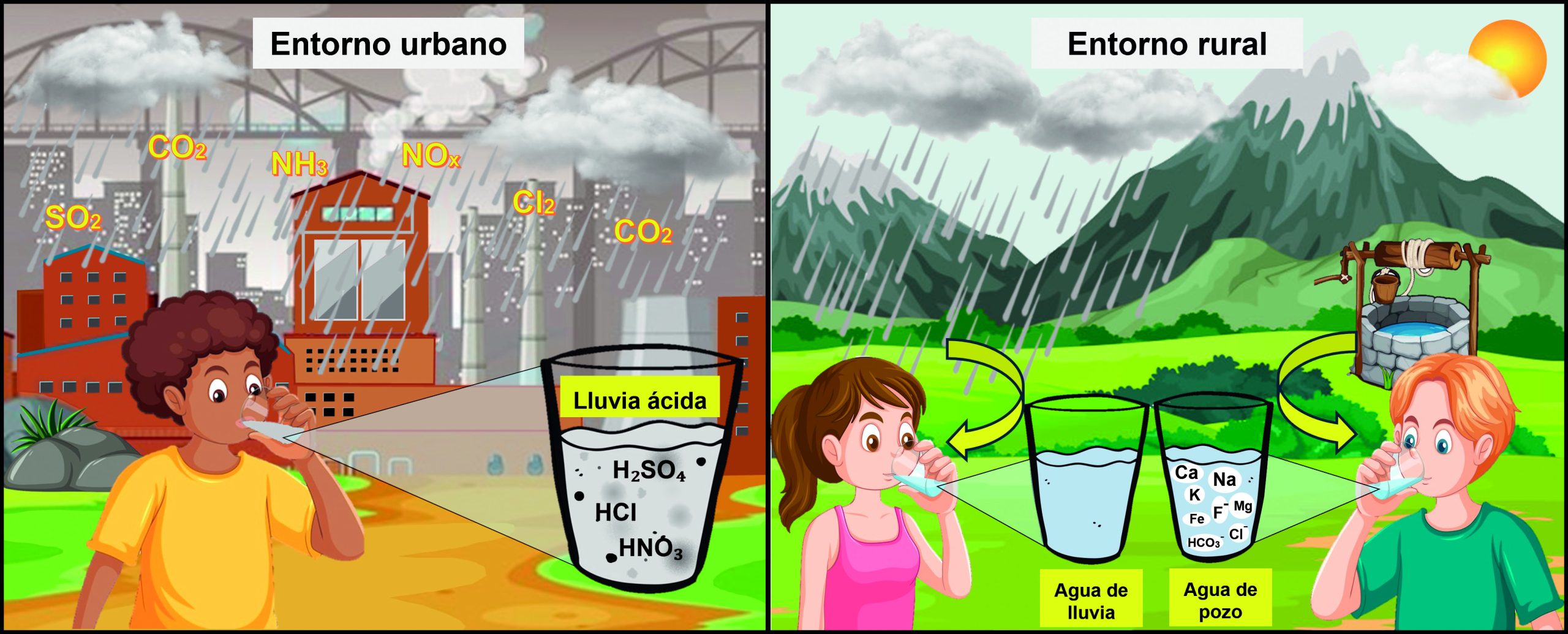 Ahora que sabemos que el agua de lluvia es ese amigo que se junta con la mayoría de los niños en el parque… es importante considerar que, por sí sola, aunque no tiene contaminantes, es ligeramente ácida. Entonces, ¿es malo tomarla porque es ácida? Calma… estamos hablando de agua ácida inofensiva que no causa efectos negativos a nuestro cuerpo. Incluso… ¿sabías que el consumo cotidiano de sustancias ácidas es más común de lo que imaginas? Las ingerimos al tomar una aspirina porque contiene ácido acetilsalicílico o al beber un vaso de agua de limón, naranja o piña (frutas que contienen ácido cítrico).