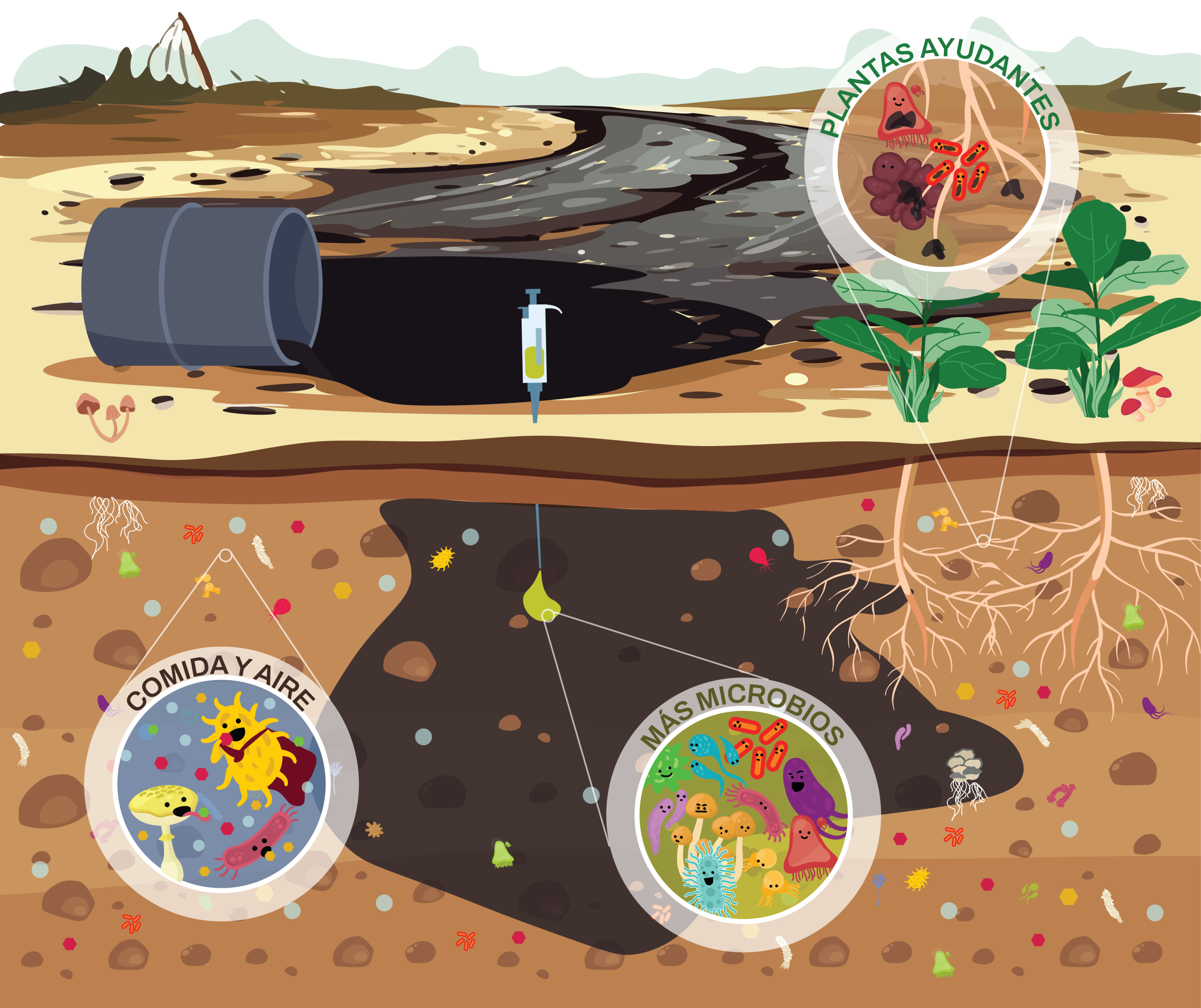 Podemos imaginar que el suelo contaminado es un espacio alterado por sustancias tóxicas que deben ser eliminadas. Estos microbios actúan como agentes que transforman los contaminantes en compuestos menos dañinos. Lo mejor es que trabajan sin descanso, día y noche, para dejarlo limpio otra vez.