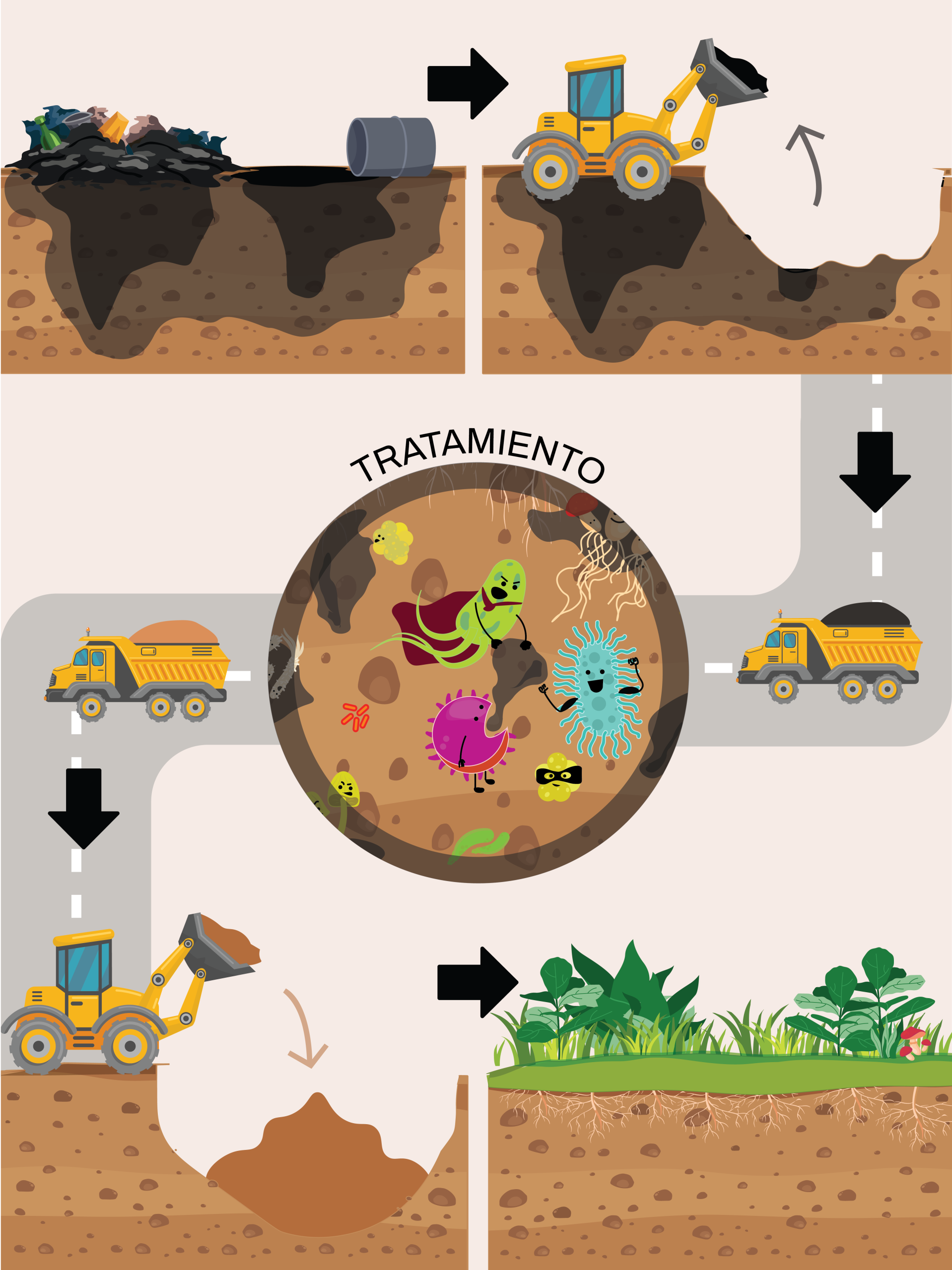 Limpiando ahí mismo o llevando el suelo a otra área: dependiendo del problema, el proceso puede hacerse en el sitio específico o llevándolo a un lugar especial donde tratarlo. A veces es más conveniente removerlo y de esta manera sanearlo bien y luego devolverlo (figura 3). Este procedimiento se llama biorremediación, in situ cuando