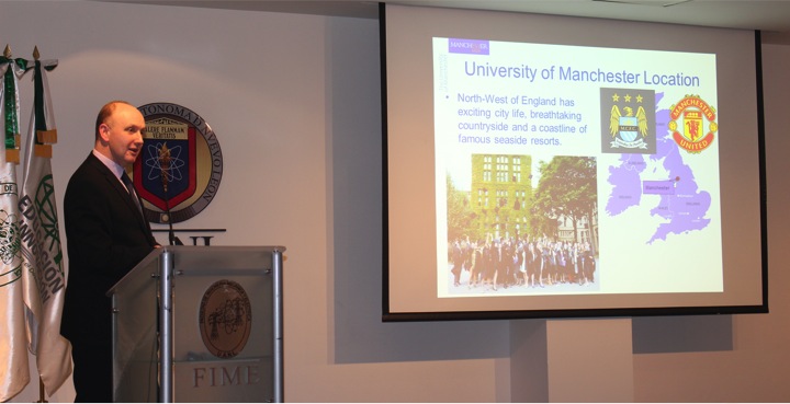 El 13 de marzo de 2015, en la Facultad de Ingeniería Mecánica y Eléctrica de la UANL se llevó a cabo la conferencia “Las oportunidades en la Universidad de Manchester”, en la sala polivalente de la Facultad. Como exponentes estuvieron el profesor Colin Bailey, vicepresidente de la Universidad de Manchester, y la doctora Teresa Alonso, directora del Programa Latinoamericano de la Universidad de Manchester, quienes informaron e invitaron a los estudiantes de posgrado de la FIME a irse a estudiar por medio de una intercambio a la Universidad de Manchester.