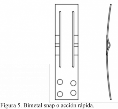 Por lo cual se determina reemplazar la acción continua del bimetal en cantiléver (la acción continua del cantiléver consiste en la flexión gradual provocada por el calor), por la acción de impulso de un bimetal de snap o de chasquido, figura 5 (la acción de snap consiste en un cambio repentino de estado del bimetal, al llegar a un valor preciso de calor), resultando en un mecanismo más óptimo.